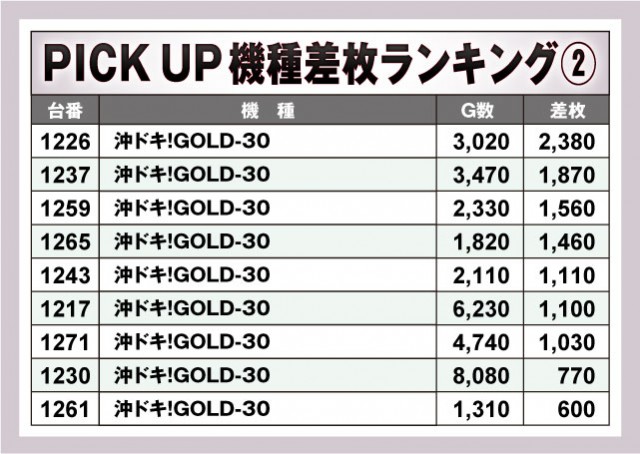 いまだ人気が衰えない『沖ドキ!GOLD-30』の差枚数ランキングもご紹介しておこう。ランキングに入っていた1239番台以外のプラス差枚数だった台はコチラ。