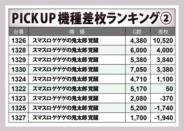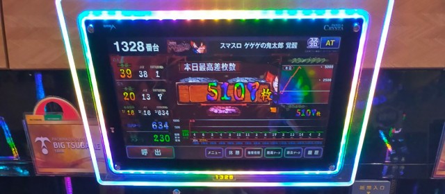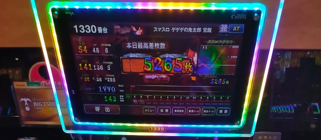 その中で全台の王座を射止めたのが新台の『スマスロ ゲゲゲの鬼太郎 覚醒』1326番台で、+11,000枚弱をマークした他、さらに同コーナーでは+4,000枚超・+3,800枚超・+3,400枚弱が1台ずつと店内随一の盛り上がりを見せた。