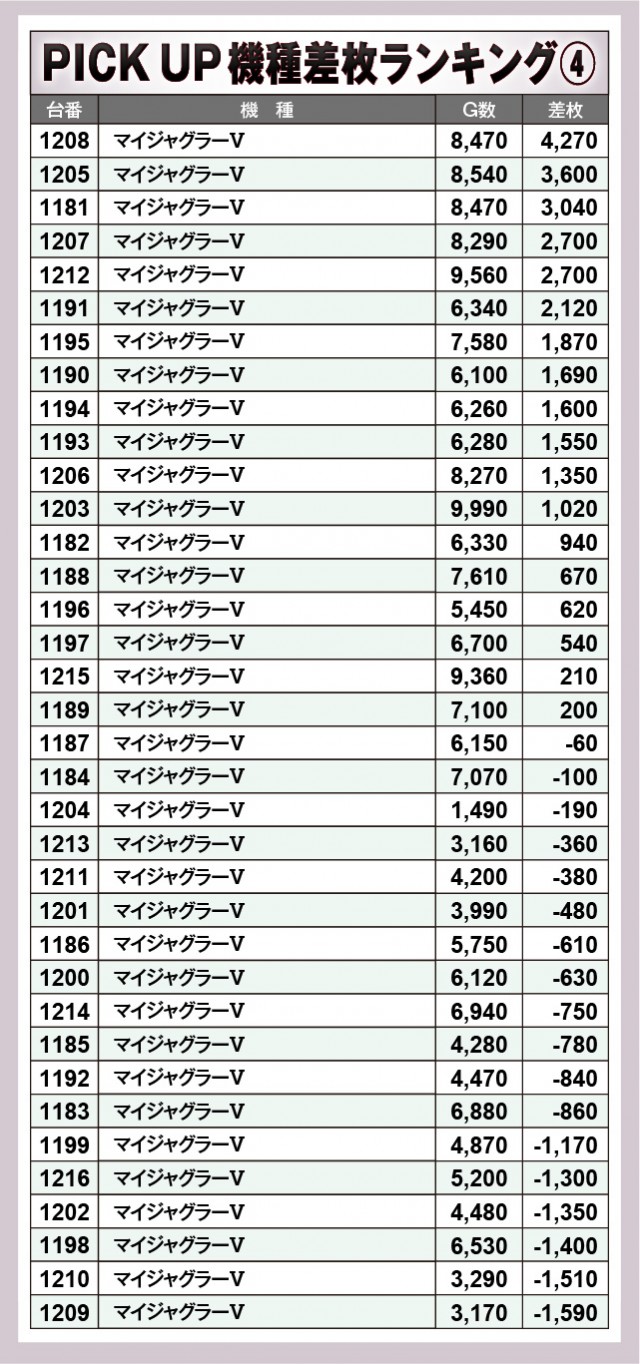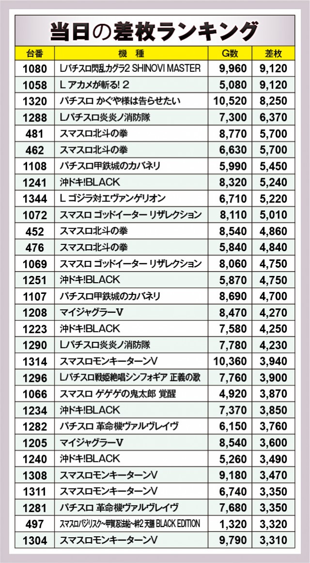 4つの優秀機種をピックアップしているが、いずれもマイナスが少なくなっているのが特徴的だ。コンスタントな大当りを積み重ねる光景が広がり、ファンはレバーを叩く喜びを覚えたのではないだろうか。特に『マイジャグラーⅤ』は右肩上がりのグラフを描き、『パチスロ甲鉄城のカバネリ』『Lパチスロ炎炎ノ消防隊』もまとまった出玉を獲得していたのが鮮烈だ。