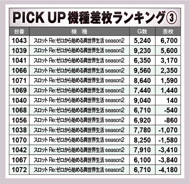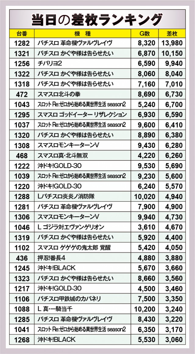 万枚OVERを達成した『パチスロ 革命機ヴァルヴレイヴ』『パチスロ かぐや様は告らせたい』は言わずもがなの活躍で、まとまった出玉を確保する台の多さに脱帽せざるを得ない。そして『スロット Re:ゼロから始める異世界生活 season2』『沖ドキ!GOLD-30』も活気と熱気に包まれており、優秀機種から盛り上がりが始まったと言えるだろう。やはり回転数の多さから好感触を掴んでいたのは確かで、ファンは口角を緩めていたに違いない。