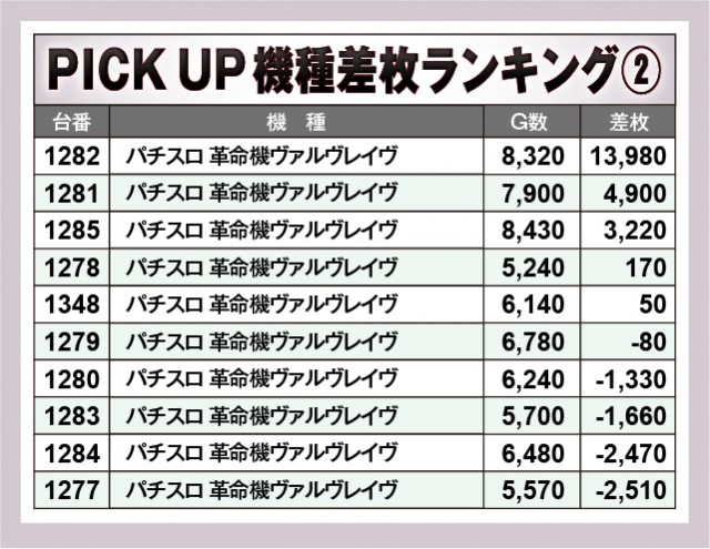 『パチスロ 革命機ヴァルヴレイヴ』『パチスロ かぐや様は告らせたい』の2台から万枚OVERが発生し、当日の店内に大きな熱気をもたらした。さらに『チバリヨ2』は惜しくも万枚を逃す9,940枚となっており、またほとんどの台で終日を通して打ち込まれた台を確認できる。誰しもが手応えを感じていたのは間違いなく、有意義な時間を過ごしていたことだろう。