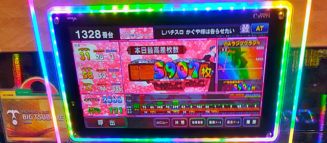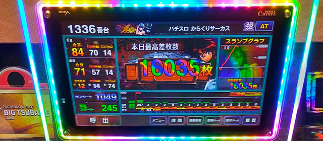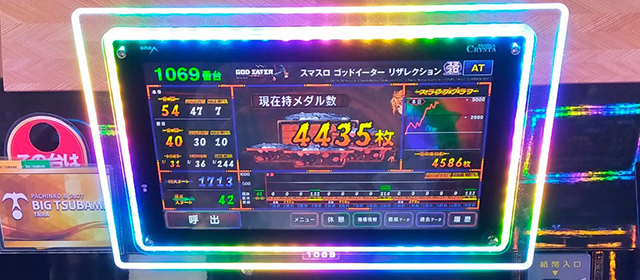 なんと万枚達成台が3台も誕生! 『パチスロ からくりサーカス』1336番台が+18,500枚。『スマスロ ゴッドイーター リザレクション』1069番台が+18,490枚。『パチスロ かぐや様は告らせたい』1318番台が+10,170枚と、なんとも華々しい差枚を叩きだした。
