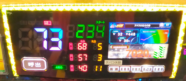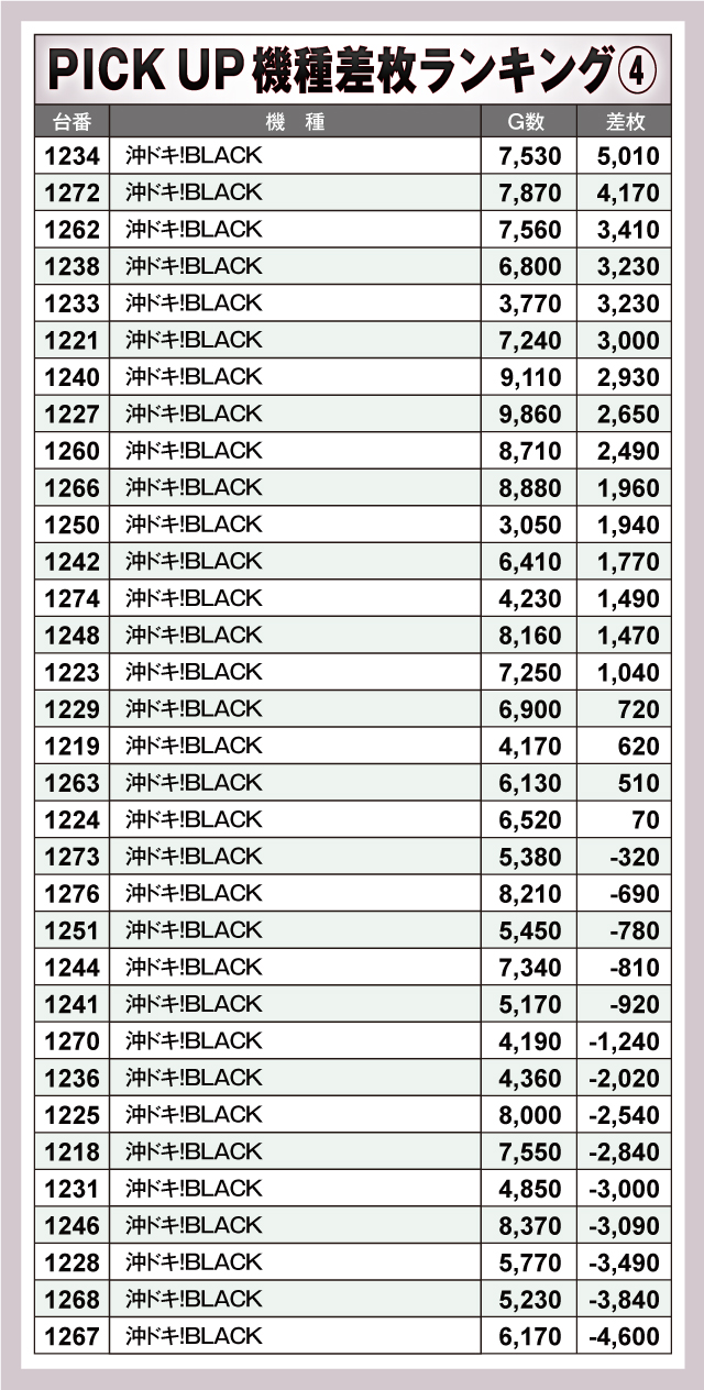 同店のパチスロの中でも最大設置台数を誇る『沖ドキ!BLACK』は、1234番台の+5,010枚を筆頭に優秀台がズラリ。もちろんマイナス差枚の台も生まれているが、この機種に関しては設置台数の多さが結果に比例したといえるだろう。
