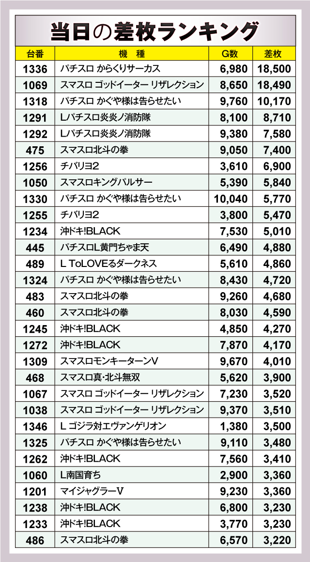 万枚突破を含む5,000枚オーバーが7台も飛びだした前回を受け、今回はどのような結果となるだろうか。それではランキングを見ていくこととしよう。