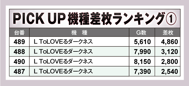 機種ごとに見てみると、特筆すべきは『L ToLOVEるダークネス』。設置している4台すべてが+2,500枚を超え、少ない台数にもかかわらず好成績を残している。『A-SLOT+ この素晴らしい世界に祝福を!』はG数が足りなかったのか、ふるわない結果に。『Lパチスロ炎炎ノ消防隊』は総合ランキングに入った2台以外は低調のままであった。