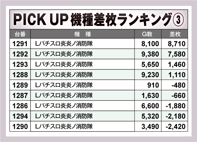 ほかには『Lパチスロ炎炎ノ消防隊』が2台ランクインし、+8,710枚と+7,580枚。『スマスロ北斗の拳』475番台が+7,400枚。『チバリヨ2』1256番台が+6,900枚。と、圧巻のラインナップとなっている。