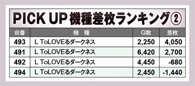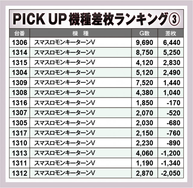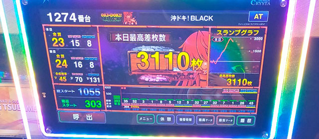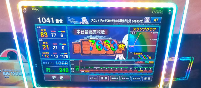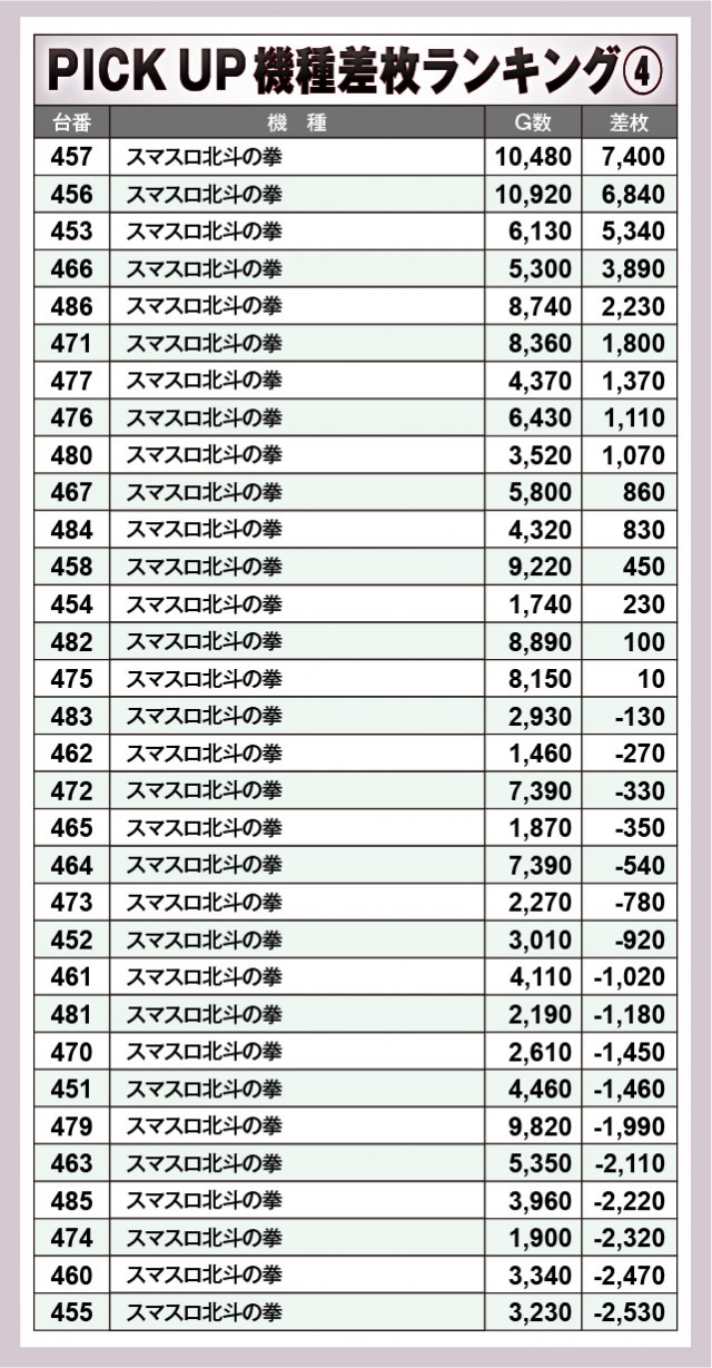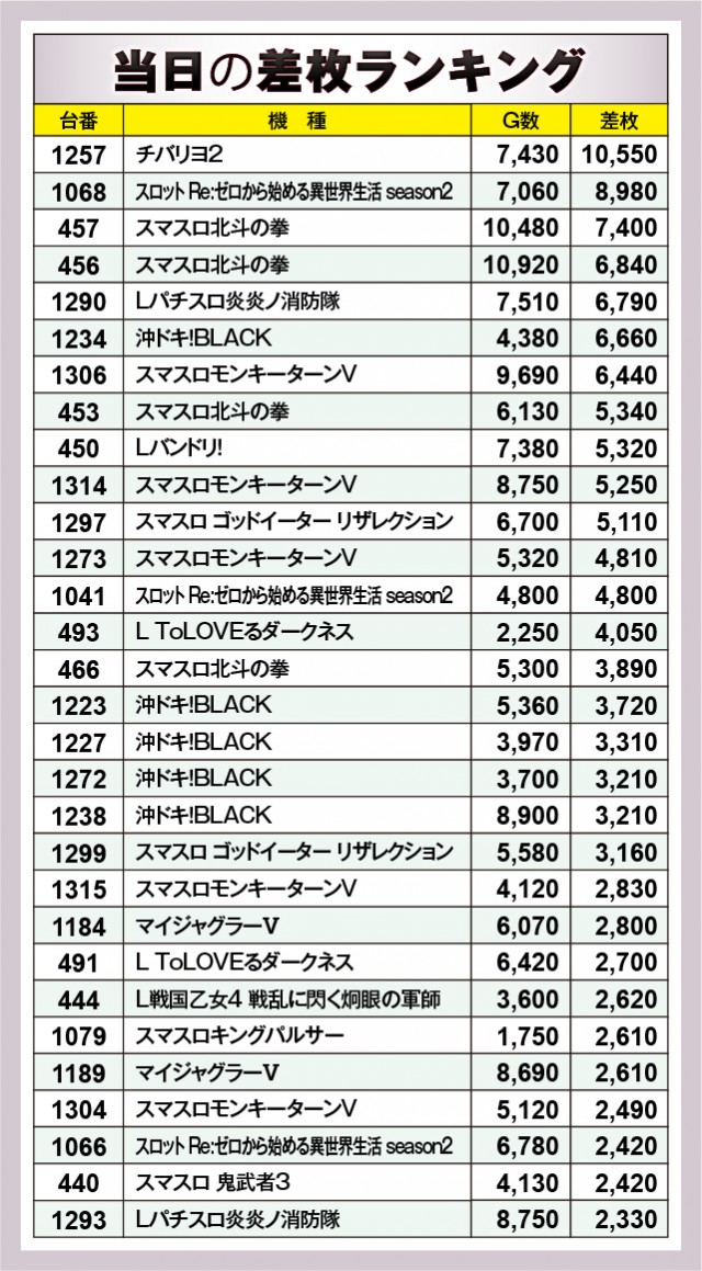 『チバリヨ2』にて万枚OVERが発生し、当日の店内の熱気を牽引する存在となっていた。他にも大台突破台が多く見られるのが特徴的で、そこに『スマスロ北斗の拳』の万回転OVERが目に焼きつく。そして『沖ドキ!BLACK』や『スマスロモンキーターンV』も多く名を連ねており、遊技していたファンは満足度の高い1日を過ごせたはずだ。