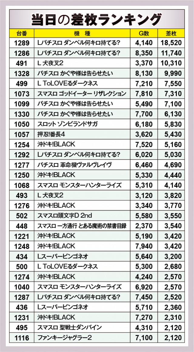 『Lパチスロ ダンベル何キロ持てる?』『L 犬夜叉2』から合計3台の万枚OVERが発生し、さらにそのすぐ後ろには『パチスロ かぐや様は告らせたい』9,990枚と惜しくも万枚を逃した台も確認できる。凄まじい熱気が店内を包み込んでいた様子がハッキリと分かり、それもファンが相当な手応えを感じていた他ならない。じっくりと打ち込まれた台が多くなっており、誰もが有意義な時間を過ごしていたことだろう。
