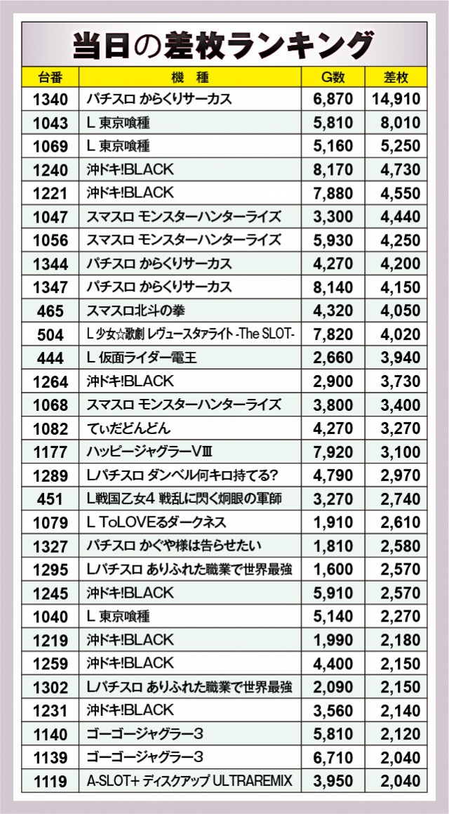 『パチスロ からくりサーカス』にて万枚OVERの大きな熱気が噴出し、さらに『L 東京喰種』も大台突破台で盛り上がりに貢献していた。各種人気AT機の活躍が目立つ内容だが、『沖ドキ!BLACK』は多く名を連ねており、存在感を発揮していた機種の1つと言えよう。全体的にまとまった出玉を確保する台が多く、遊技していたファンは右肩上がりに伸びる出玉を前にしては、高揚感を抑えきれなかったことだろう。