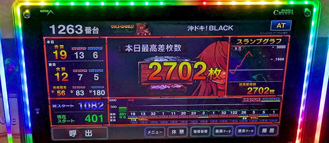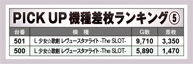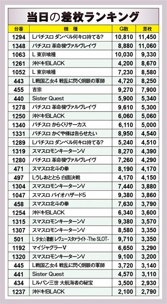 『Lパチスロ ダンベル何キロ持てる?』『パチスロ 革命機ヴァルヴレイヴ』にて万枚OVERが飛び出しており、さらに『L 東京喰種』も9,000枚OVERで追随。他にも8,000枚台をはじめとした、まとまった出玉を確保する台が多くなっており、大きな熱気が館内を包み込んでいたと言える。万回転OVERなど高い回転数を記録していた点も見逃せず、活気にも満ちていたのは好感を覚えるポイントだ。