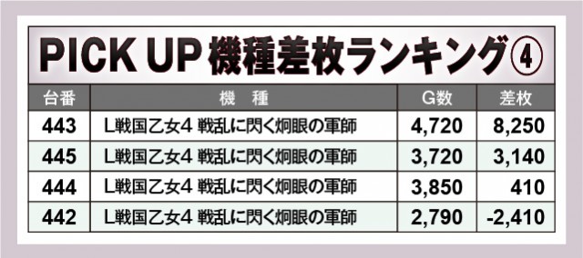 『L戦国乙女4 戦乱に閃く炯眼の軍師』『吉宗』からは7~8,000枚OVERが発生しており、さらに後者は注目の新台とだけあって、終日を通して打ち込まれている。『スマスロモンキーターンV』『沖ドキ!BLACK』といった人気機種も盛り上がり、優秀機種として恥じない活躍を披露していた。また『ハッピージャグラーVⅢ』はノーマル機を代表する存在となっており、回転数と差枚数が比例する展開を披露していた点も目を見張る部分だ。