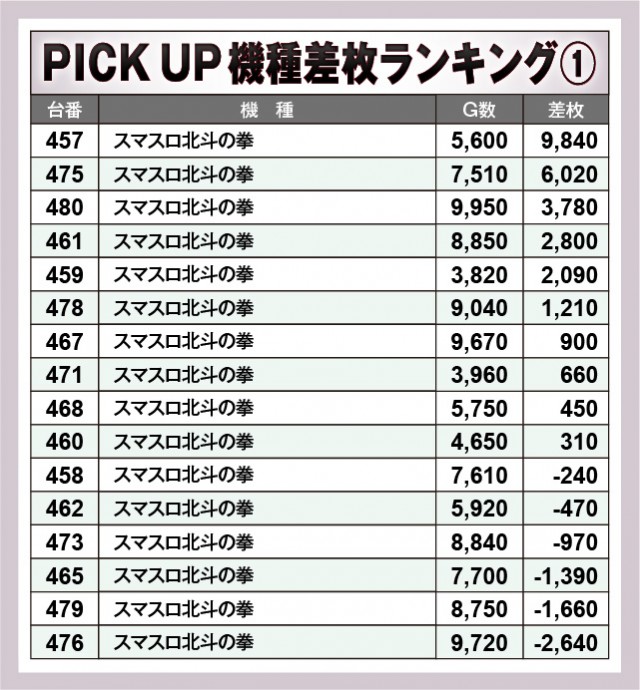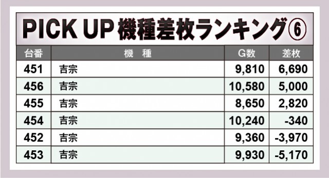 優秀機種として名を連ねた上表の6機種は、いずれも大きな熱気を放っていたのが鮮烈だ。『スマスロ北斗の拳』は惜しくも万枚到達を逃す9,840枚を記録し、『沖ドキ!BLACK』は8,000枚OVER、『パチスロ からくりサーカス』も7,000枚OVERと気を吐いていた。いずれも終日を通して打ち込まれた活気に満ちたエリアとなっており、その中でも『吉宗』は万回転OVERを輩出するなど、大きな賑わいを披露していたのが目につくばかりだ。