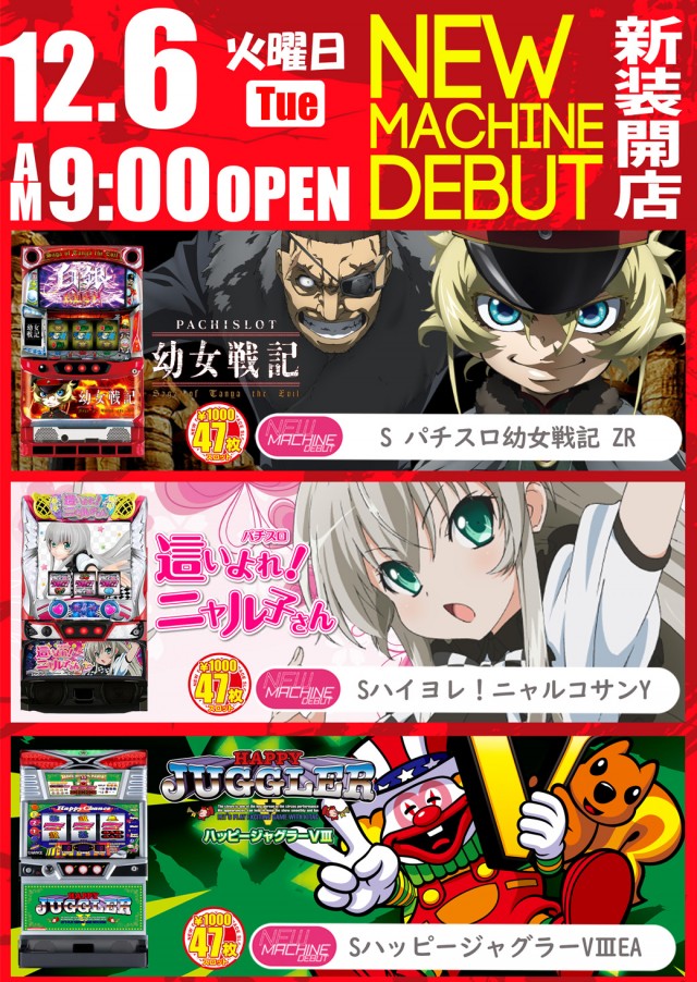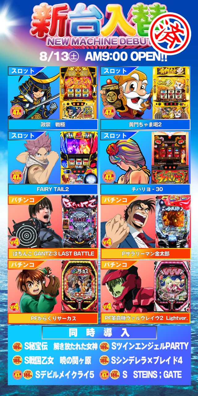 本日、新装開店!朝9時オープン♪最新台導入!