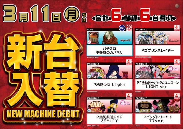 🌟本日新台入替予定🏯Sカバネリ増台🌟全6機種🌟