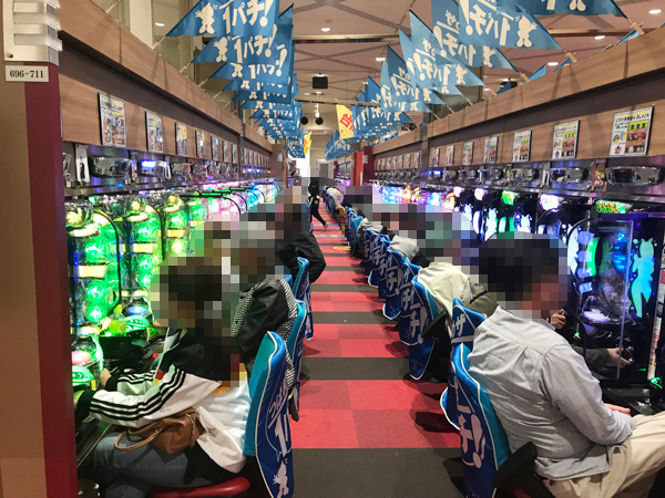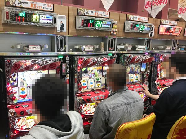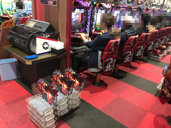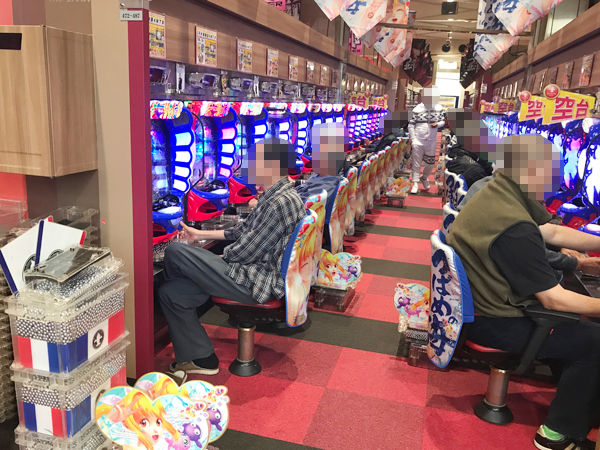 15時半ごろの4円パチンココーナーをチェックすると、「CR大海物語4」や「CRぱちんこ仮面ライダー フルスロットル 闇のバトルver.」の盛り上がりもかなり大きく、あちこちで微笑ましいシーンを確認している。