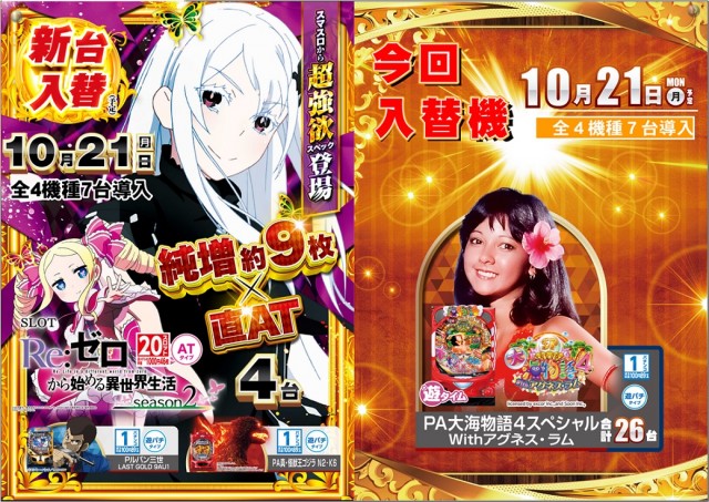 本日10月21日 新台入替/Sリゼロ2含む、全4機種7台導入