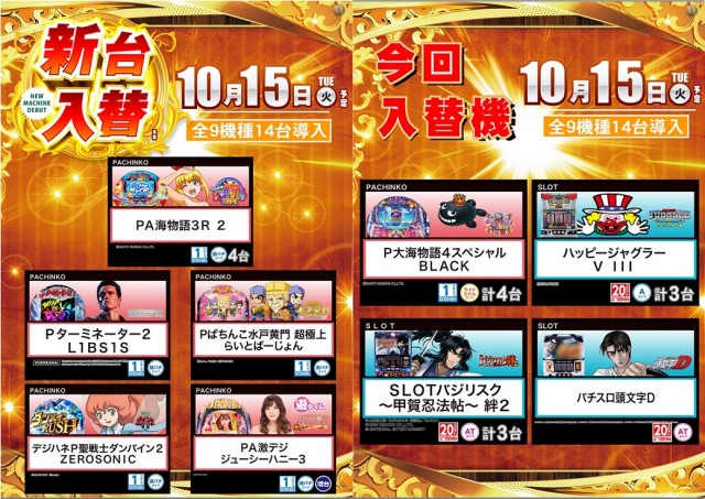 明日10月21日 新台入替/Sリゼロ2含む、全4機種7台導入