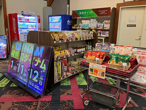 景品コーナーにはお菓子・インスタント食品・酒類など多彩なアイテムが揃っており、プレイヤーたちの目を引いていた。