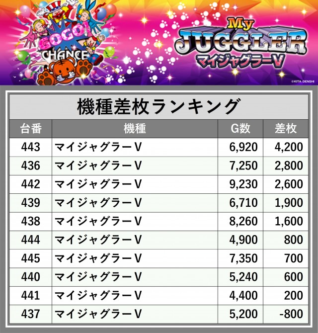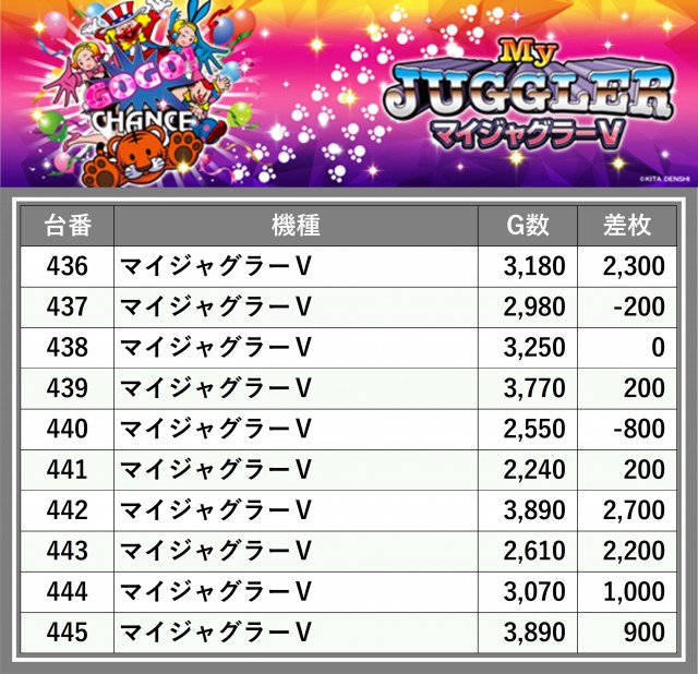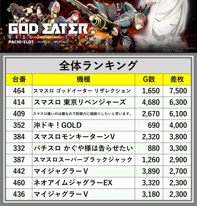 厳選された取材対象機種をはじめ、その他スロット全体から好記録が飛び出した!プレイヤーが楽しんだ1日を下記データにて振り返ってみて欲しい。