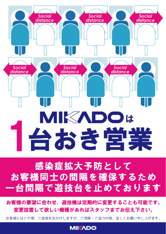■遊技台を1台置きに稼働を停止してお客様同士の距離を確保しての営業をしております