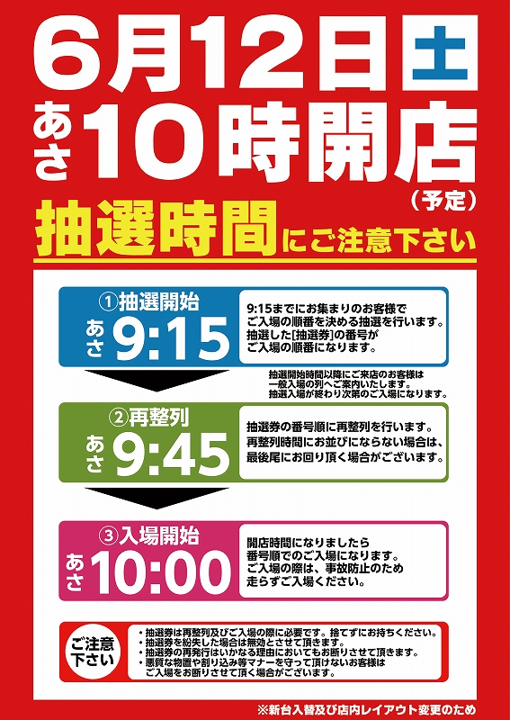 抽選開始時間:朝8時30分 ※抽選開始時間以降にご来店のお客様は一般入場となり、抽選入場が終わり次第のご入場となります。 |