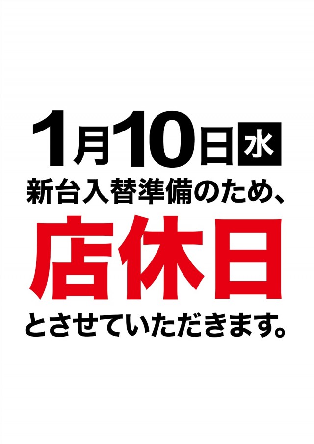 ZENT市ノ坪店 1月10日(水)新台入替準備の為店休日!