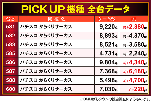 5台がプラスとなった「パチスロ からくりサーカス」では、587番台が約+6,100ptオーバー!!