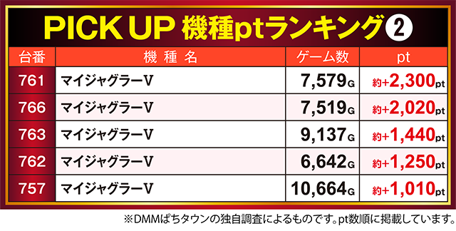「マイジャグラーⅤ」も5台が約+1,000ptを上回り、2台が約+2,000ptオーバー。