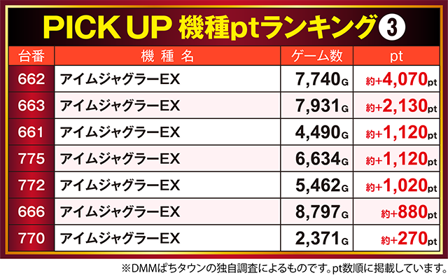 7台がプラスとなった「アイムジャグラーEX」は、662番台が約+4,000ptを記録♪