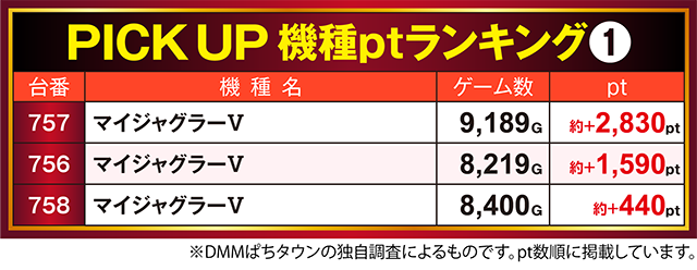 「マイジャグラーⅤ」では、757番台が約+2,830ptを記録。