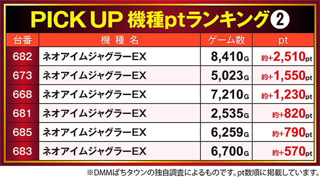 「ネオアイムジャグラーEX」も多くの台が結果を残し、682番台は約+2,510ptとなりました!