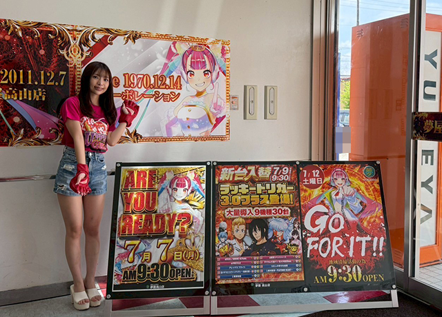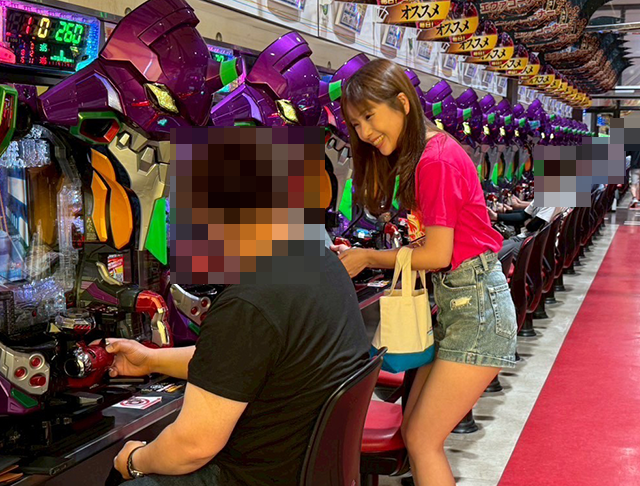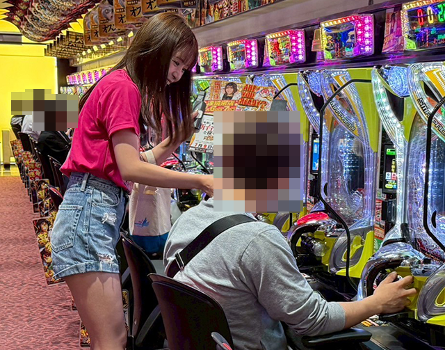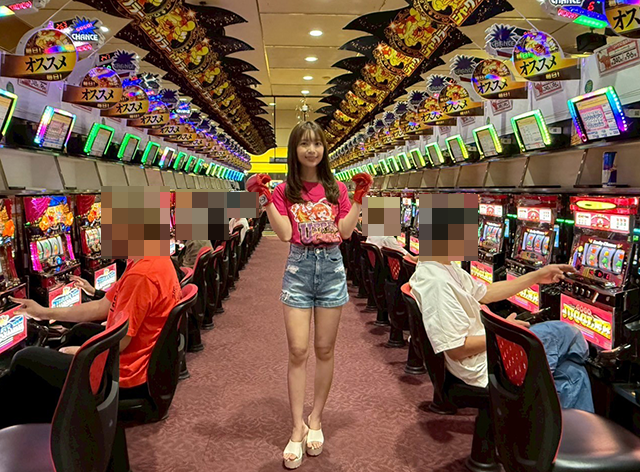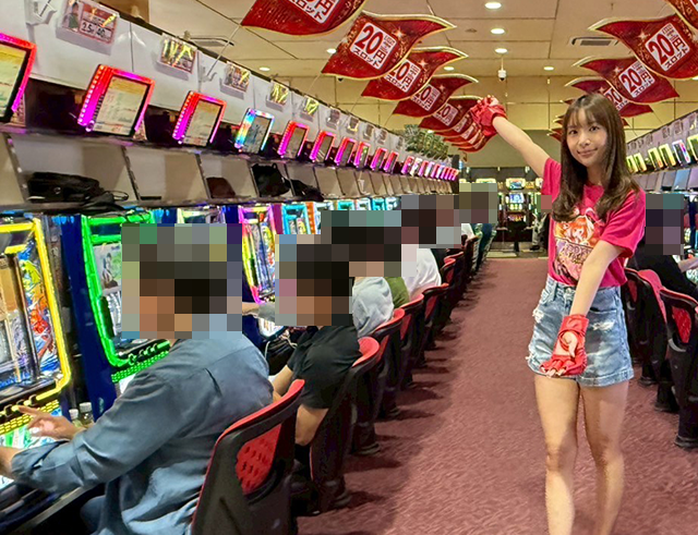 パチスロとパチンコの各コーナーをまわり、miokaちゃんのキュートな笑顔をお届け♪