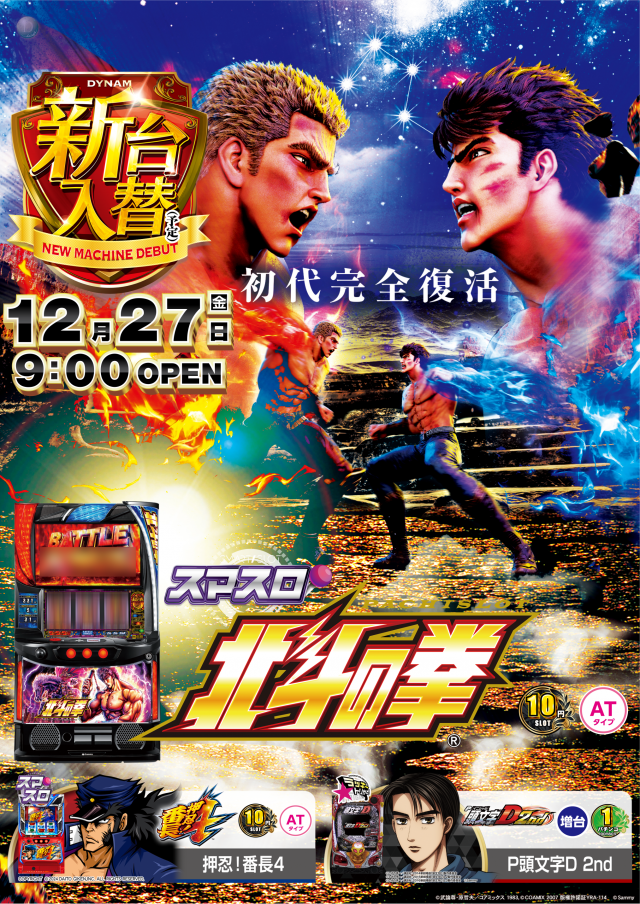 明日12/27(金)L北斗の拳、押忍!番長4他、全3機種導入