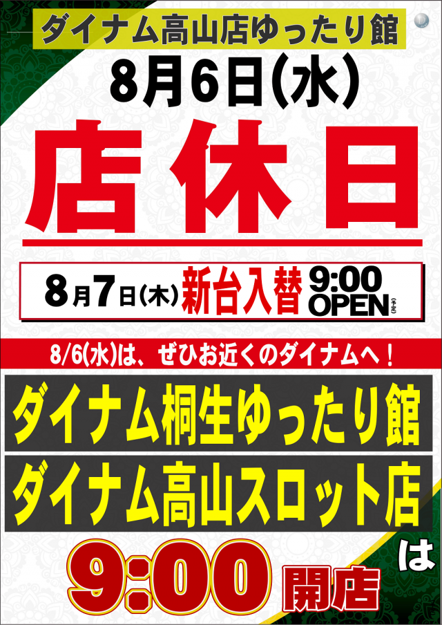 8/8(金)岐阜ダイナム14店舗 全店9:30開店
