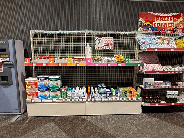 景品コーナーには日用品やお菓子など多彩なアイテムが並んでおり、プレイヤーたちの興味を引いていた。