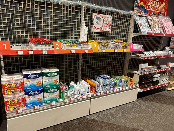 景品コーナーには日用品・キャラクターグッズ・酒類など多彩なアイテムが揃っており、プレイヤーたちの目を引いていた。