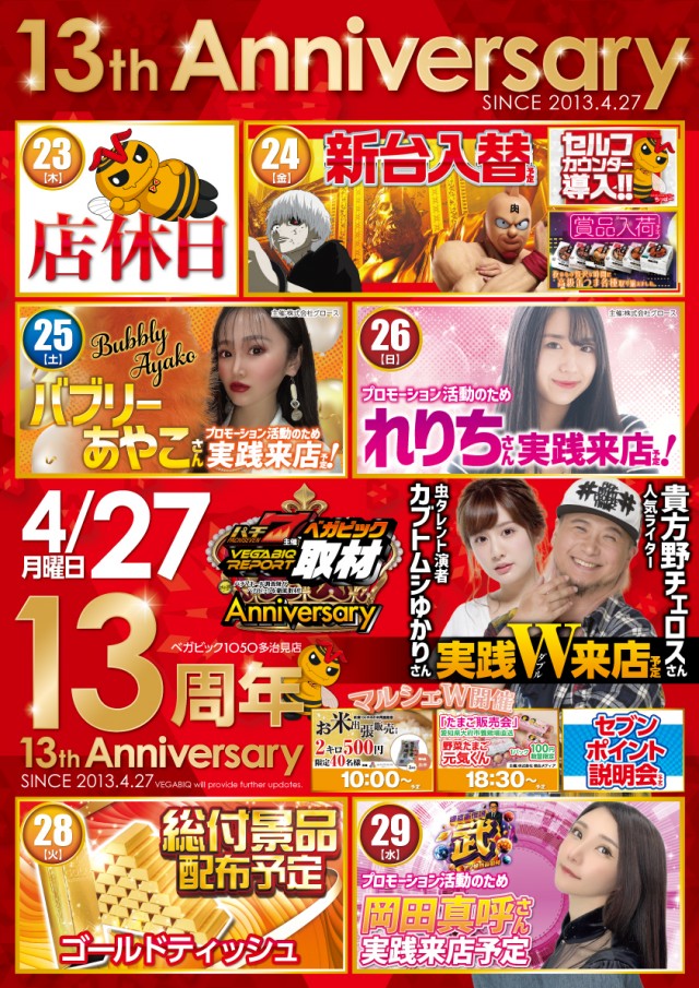 4月周年月間!本日バブリーあやこさん来店予定&新台導入済み🚀