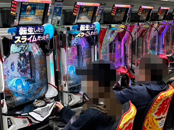 15時半ごろの4円パチンコを見てみると「e 仮面ライダー電王」や「P転生したらスライムだった件」が活況。プレイヤーの満足そうな表情から、充実した時間を過ごしていたことがうかがえる。