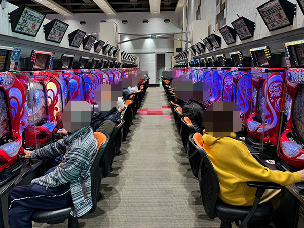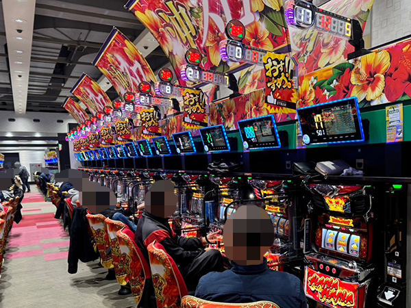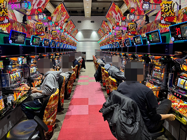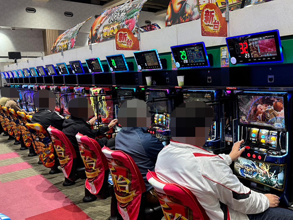 取材時は既に多くのプレイヤーが集結し、パチンコ・パチスロを問わずにぎやかな状況となっていた。