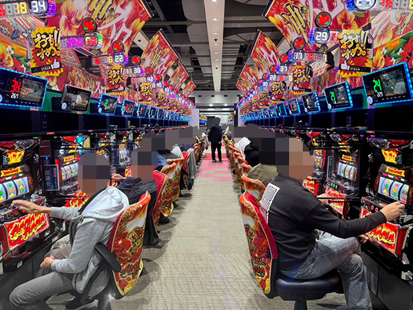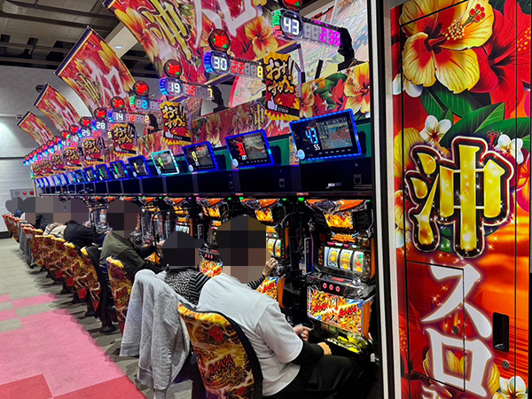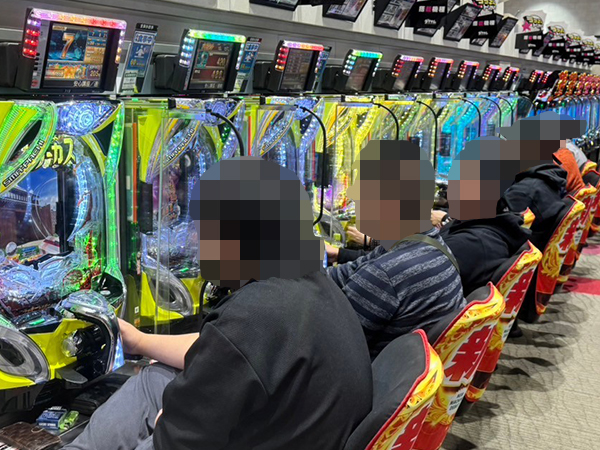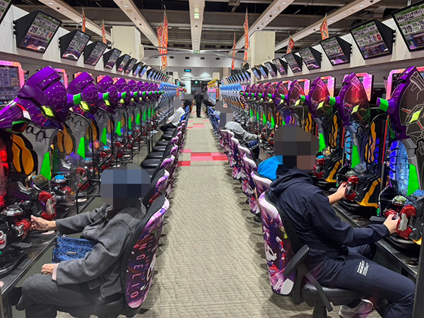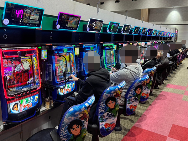 取材時は多くのプレイヤーが来店。パチンコ・パチスロともに、様々な機種が支持を得ていた。