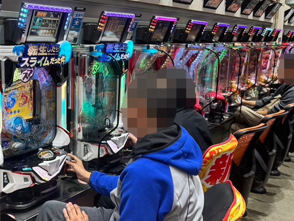 17時半ごろの4円パチンコでは「eフィーバーからくりサーカス2 魔王ver.」や「P転生したらスライムだった件」で好調なプレイヤーが見受けられ、時折見せる嬉しそうな表情が印象に残っている。