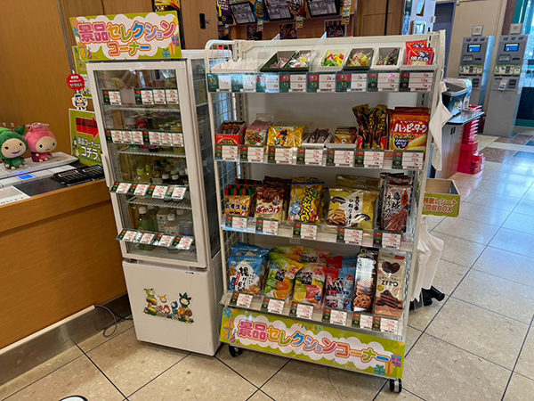 景品コーナーにはドリンク類・お菓子が豊富に用意されており、おみやげ選びも存分に楽しめることだろう。
