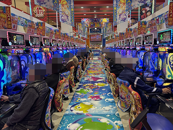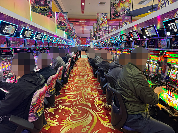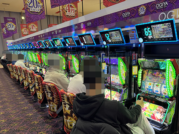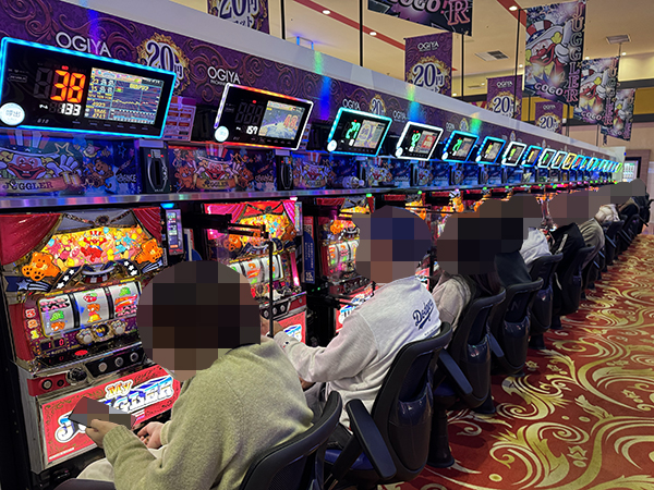 20円パチスロに目を向けると、「マイジャグラーⅤ」や「アイムジャグラーEX」、「沖ドキ!BLACK」などが微笑ましいムードに包まれており、遊技中に見せるプレイヤーの嬉しそうな表情が印象に残っている。