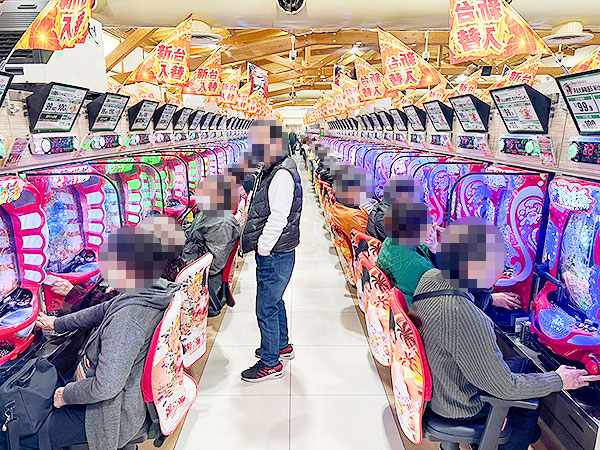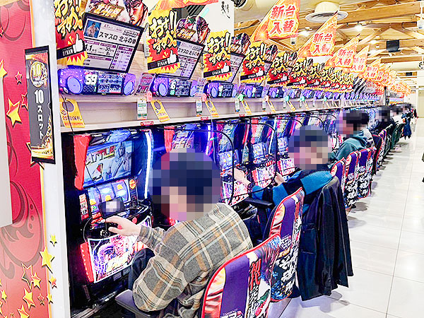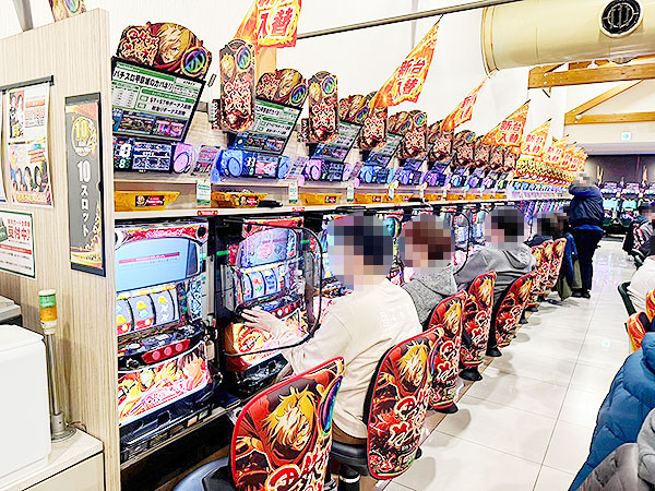 1000円/90枚パチスロを見渡すと、「スマスロ北斗の拳」や「沖ドキ!GOLD-30」で理想的な展開を迎えたプレイヤーが見られ、シマ全体に華やかな光景が広がっていた。