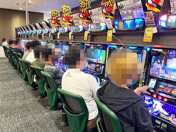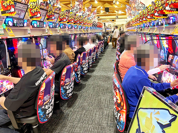 1000円/90枚パチスロに目を向けると「スマスロ北斗の拳」や「スマスロバジリスク~甲賀忍法帖~絆2 天膳 BLACK EDITION」が微笑ましい状況。機種性能を最大限に発揮するプレイヤーが複数見られた。