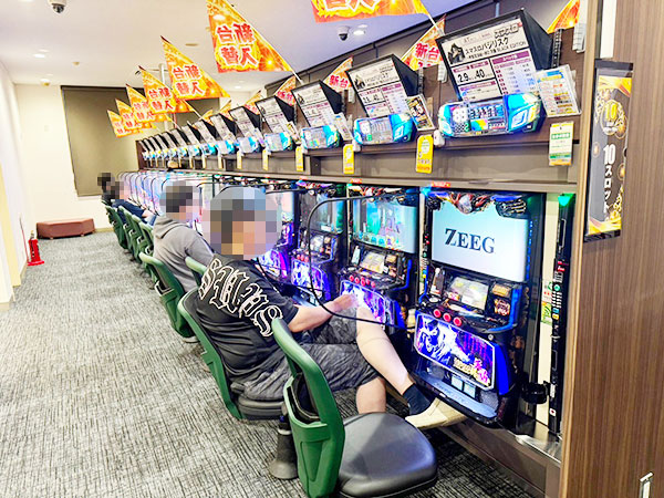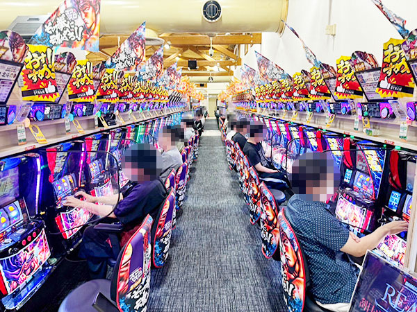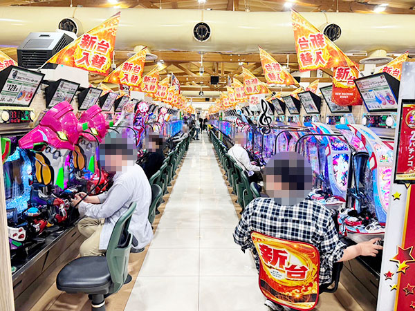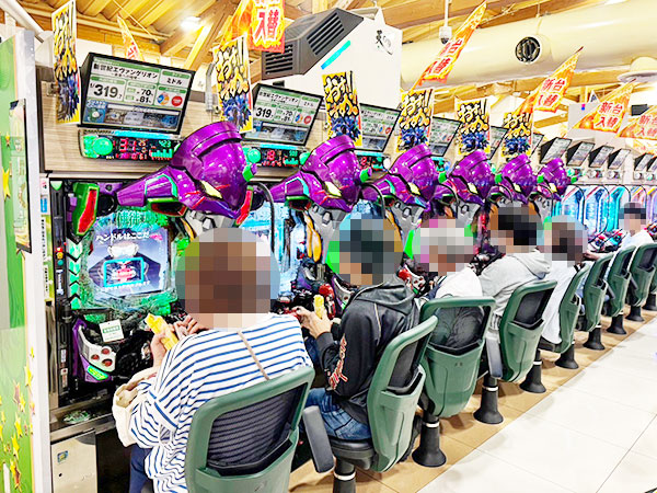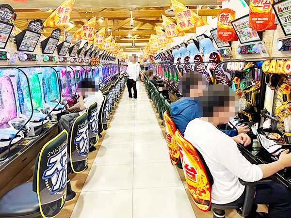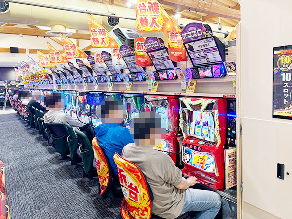 取材時は多くのプレイヤーが来店。パチンコ・パチスロともに、様々な機種が支持を得ていた。