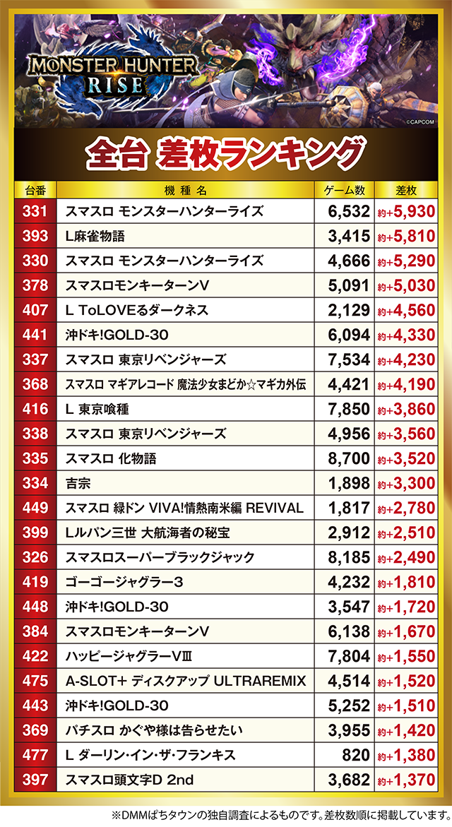 「L ToLOVEるダークネス」の407番台や「沖ドキ!GOLD-30」の441番台なども約+4,000ptオーバーと、多くの台が結果を残した。