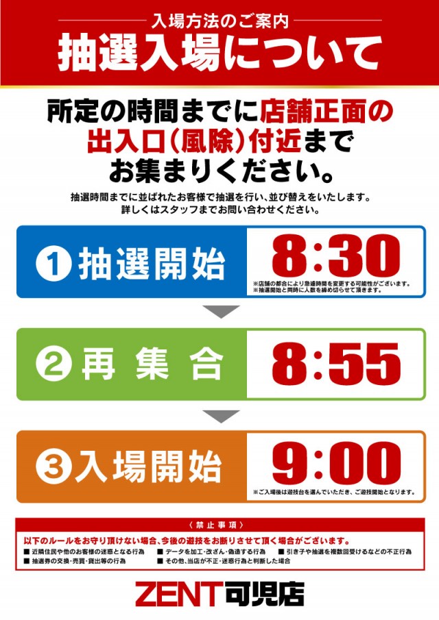 8:30までにお集まりいただいた方を対象に現地で機械を用いて抽選を行います。 |