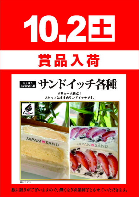 明日10月2日(土)朝9時開店!スイーツ賞品入荷♪