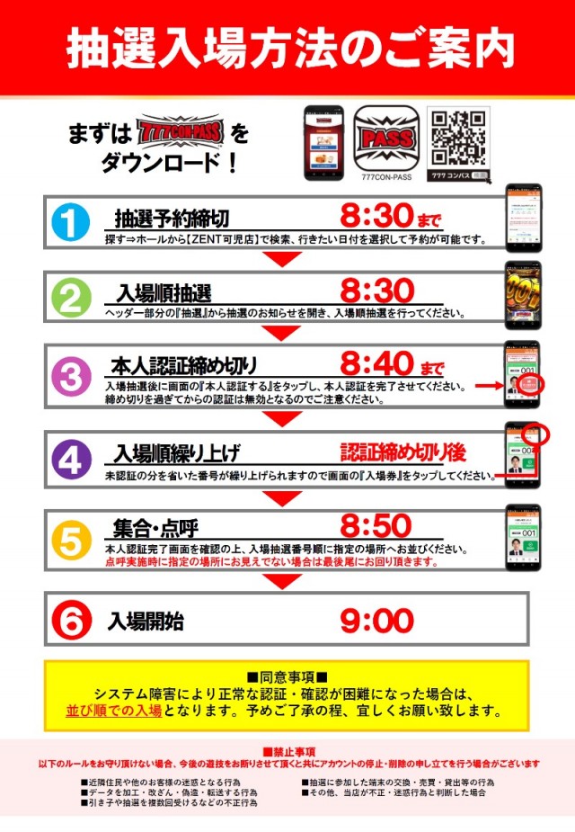 8:30までにお集まりいただいた方を対象に現地で機械を用いて抽選を行います。 |